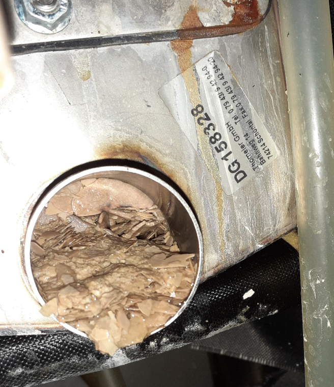Here is an example of limescale in a combination oven steam tank. The tank is totally choked with hardened scale. Unfortunately the repair was costly and came as a surprise as it believed to have been part of a daily cleaning routine.