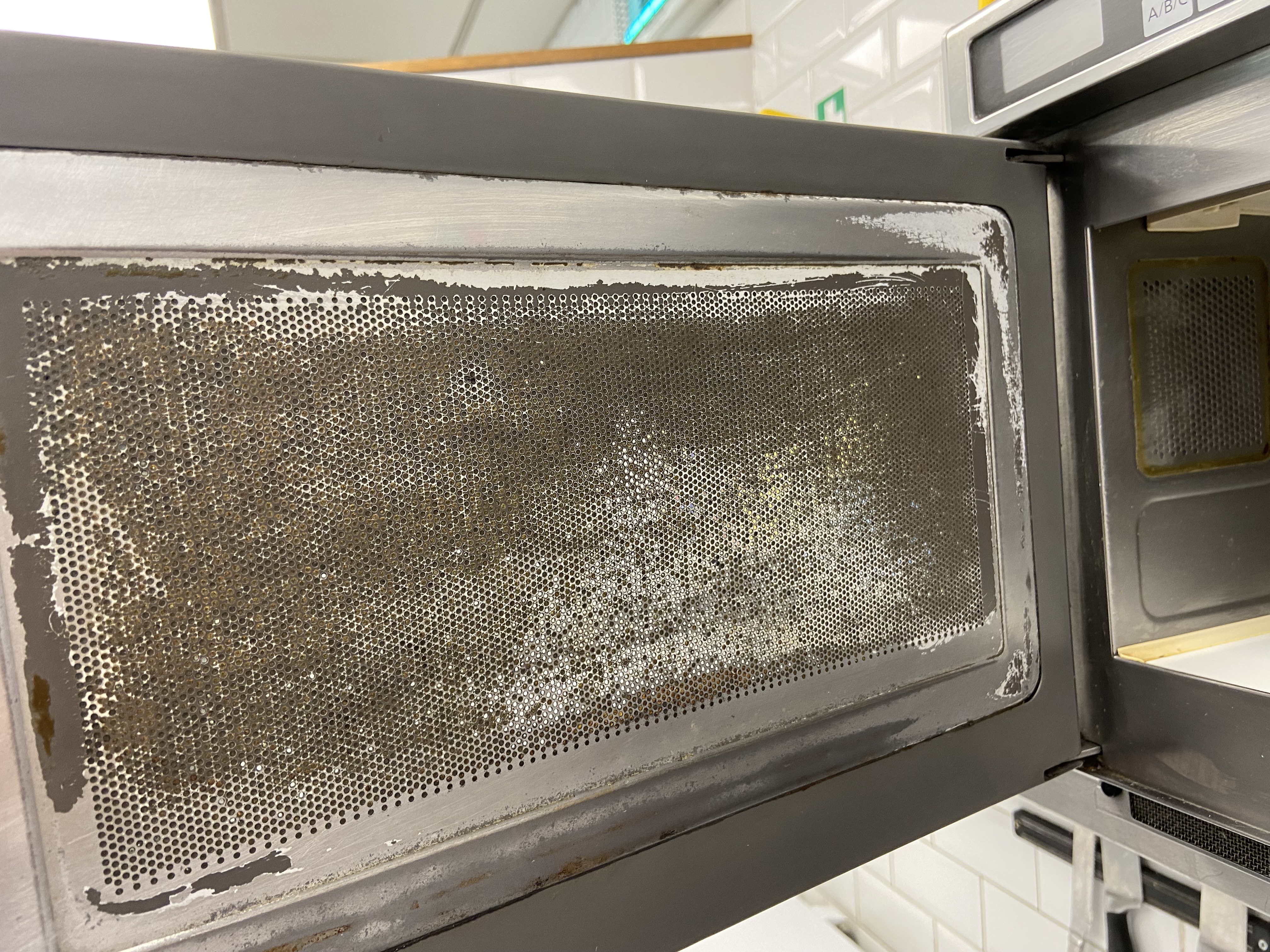 Of all the common microwave issues, this is the one that is likely to be harmful, ironically born of over cleaning. The emission protective screen has been removed by abrasive cleaning, cleaning should be by non-abrasive fabric, non-chemical cleaning agent ie lemon and water, wiped over and dried off with a paper cloth.